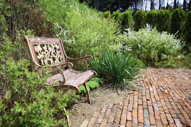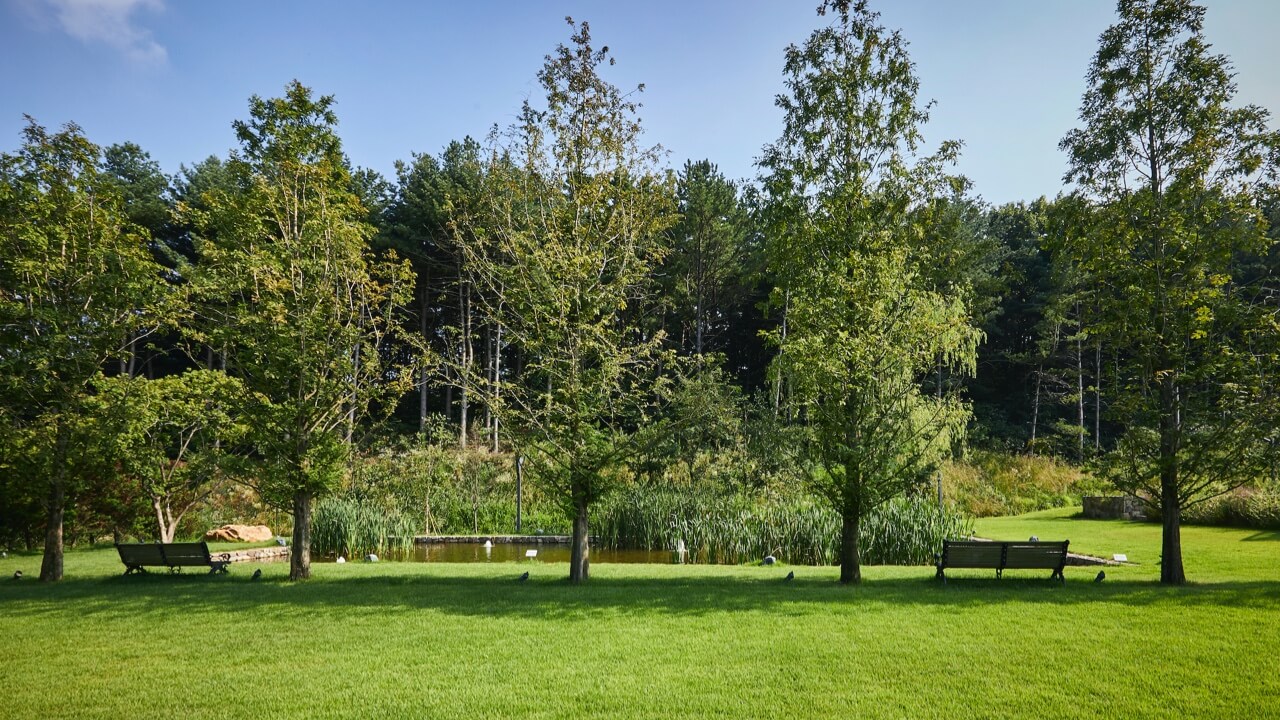 글라스하우스, 사색과 휴식을 위한 연못과 벤치.