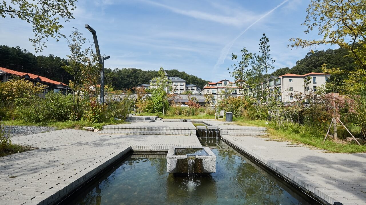 평온한 물소리와 야외 스피커로 울려 퍼지는 은은한 멜로디가 발걸음을 더욱 풍요롭게 합니다.