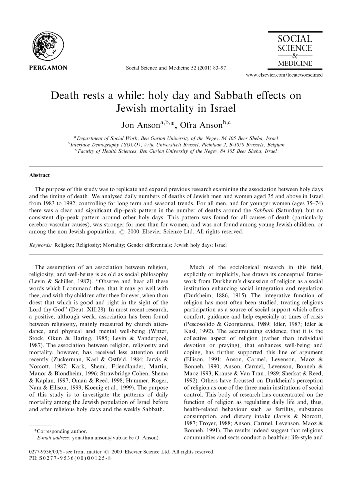 하누카와 같은 유대 명절이 노년층의 심리적 안정과 건강에 미치는 영향을 연구한 논문(Death Rests a While: Holy Day and Sabbath Effects on Jewish Mortality in Israel)에 따르면 유대인들의 명절과 안식일을 보내는 일들이 사회적 통합 및 규제 역할을 통해 개인의 신체적·정신적 건강에 긍정적 영향을 미친다고 보고한다. 실제로 이 기간 동안 노년세대의 사망률이 감소하는 연구결과를 보입니다. 하누카와 같은 종교적 명절은 시간의 흐름에 의미를 부여하고, 개인에게는 내적 강화를, 집단에는 사회적 응집력을 제공합니다. 그렇기 때문에 그 어느 시기보다 가족 간 보내는 시간의 의미가 강화되는 모습이 나타나고, 사망률의 감소라는 의미 있는 결과를 가져오게 됩니다. 이를 안식일 효과 혹은 거룩한 날 효과라고 부르기도 합니다.