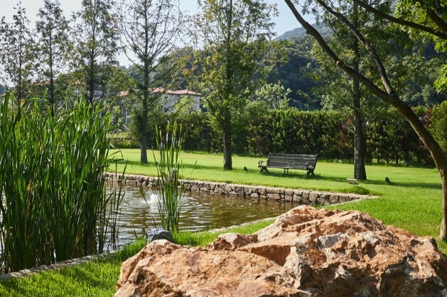 글라스하우스, 사색과 휴식을 위한 연못과 벤치.