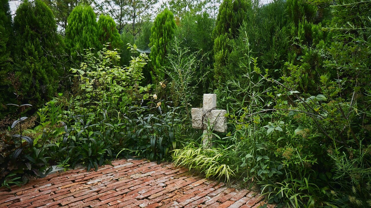 이곳은 말 그대로 기도에 의한, 기도를 위한 공간입니다. 측백나무 가림막 속에 자그마한 의자와 벤치 하나만 놓은 이 공간은 고립된 느낌마저 줄 만큼 고요합니다. 시선이 닿는 곳 끝에는 작은 석재 십자가가 담담하게 놓여 고백과 묵상, 회개와 감사의 동기를 제공합니다. 주차장 바로 곁에 자리한 것은 에덴낙원 방문의 시작과 끝이 기도가 됐으면 했기 때문입니다.